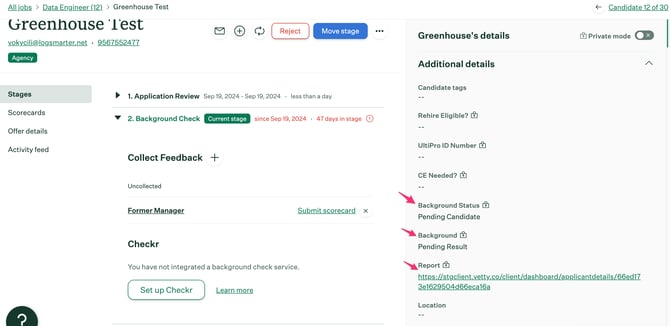 These fields let Vetty send background check updates directly into Greenhouse, so you can see candidate status without switching tabs.