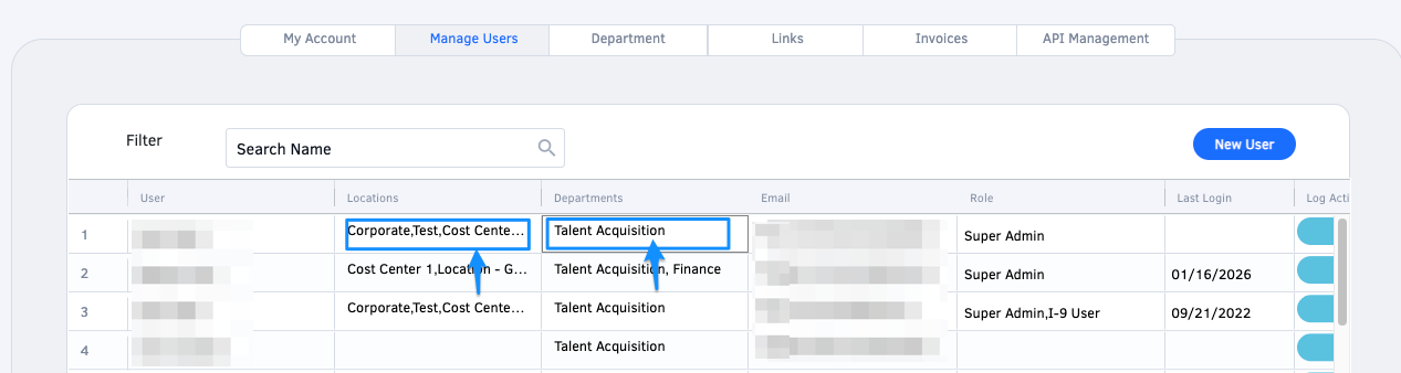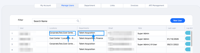 To edit a user’s Location or Department, click on the box next to their user name in the Location or Department column