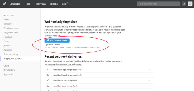 2. Click + Add webhook under the Candidate Stage Change toggle and copy the signature token.