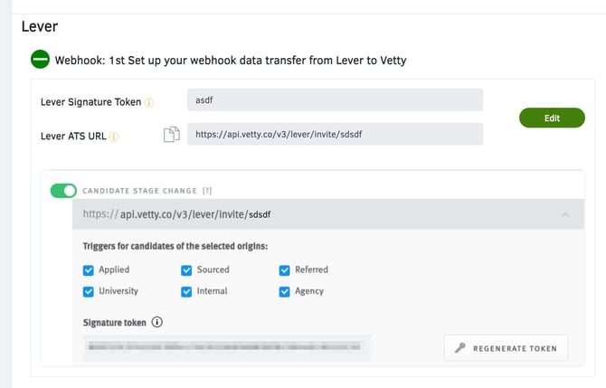 3. Paste the Signature token from Lever into the "Lever Signature Token" area.