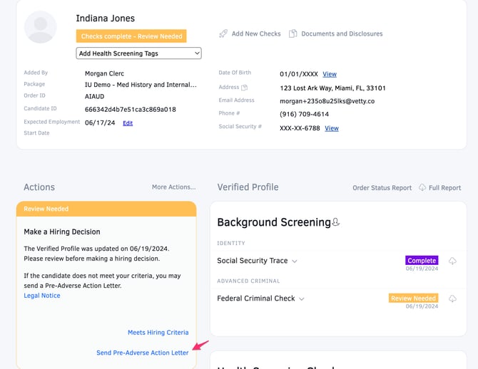 - If a completed report has been flagged as "Review Needed" (and you have the applicable permissions), you will see an option in the candidate's file that says "Send Pre-Adverse Letter."